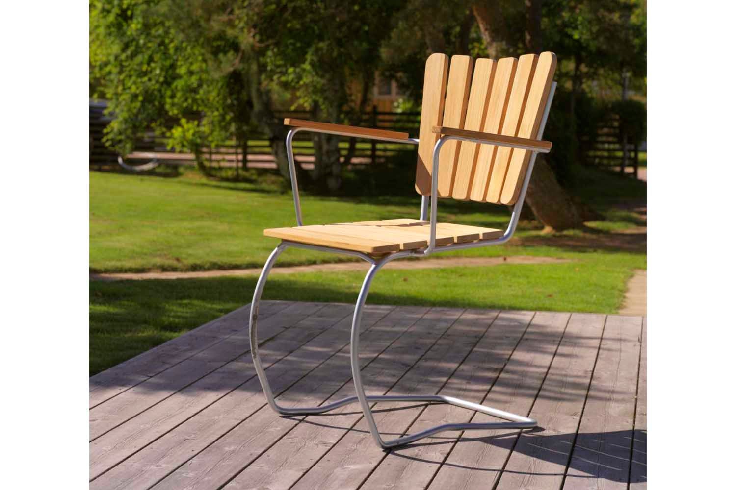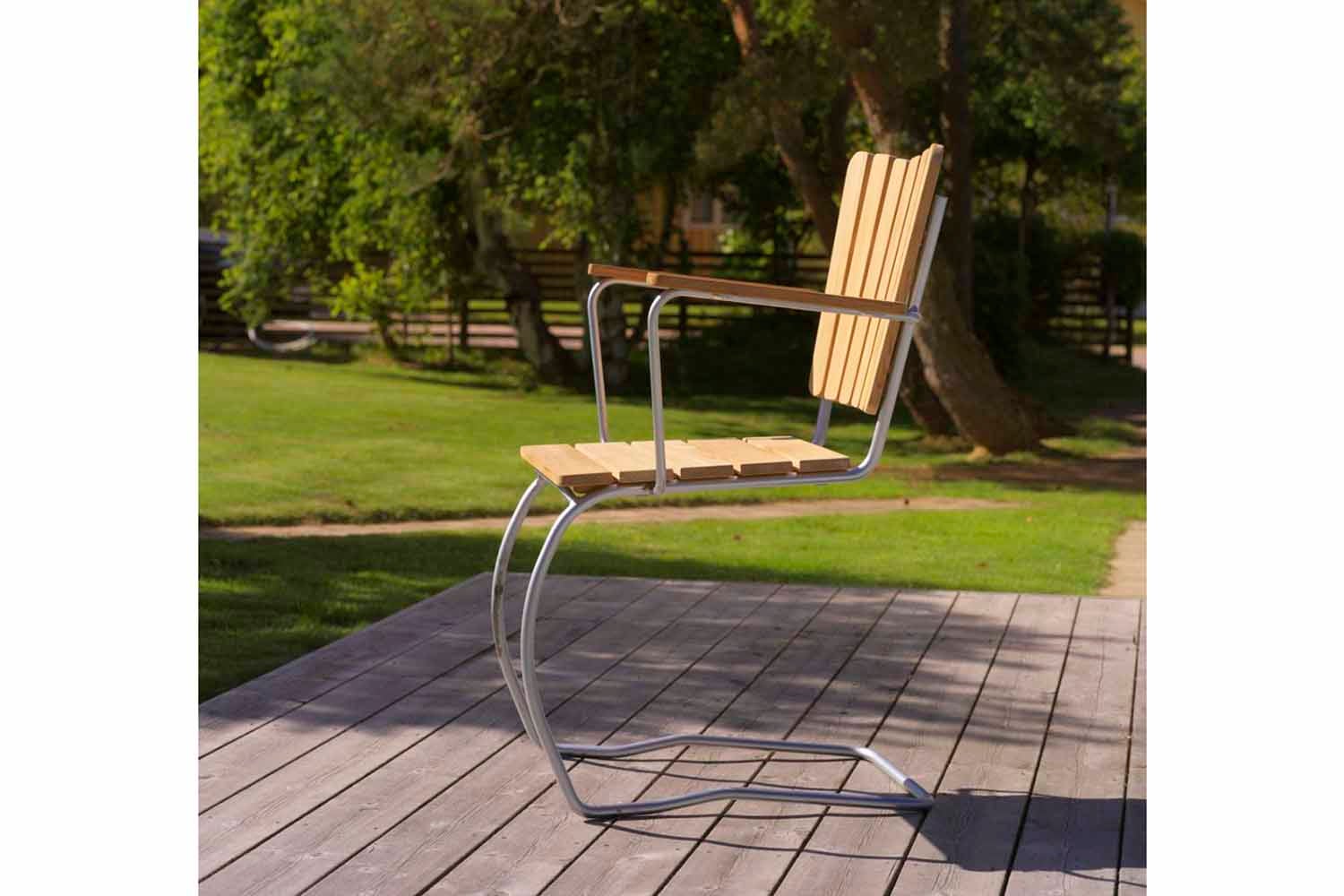 En klassisk stol som sätter begreppet tidlös design på kartan. 1956 tillverkades den allra första stolen och med sin tilltalande design där ribbor av teak snyggt bryter av mot den varmgalvaniserade stålstommen är den lika aktuell nu som då. Bordet är hopfällbart och stolarna praktiskt stapelbara.