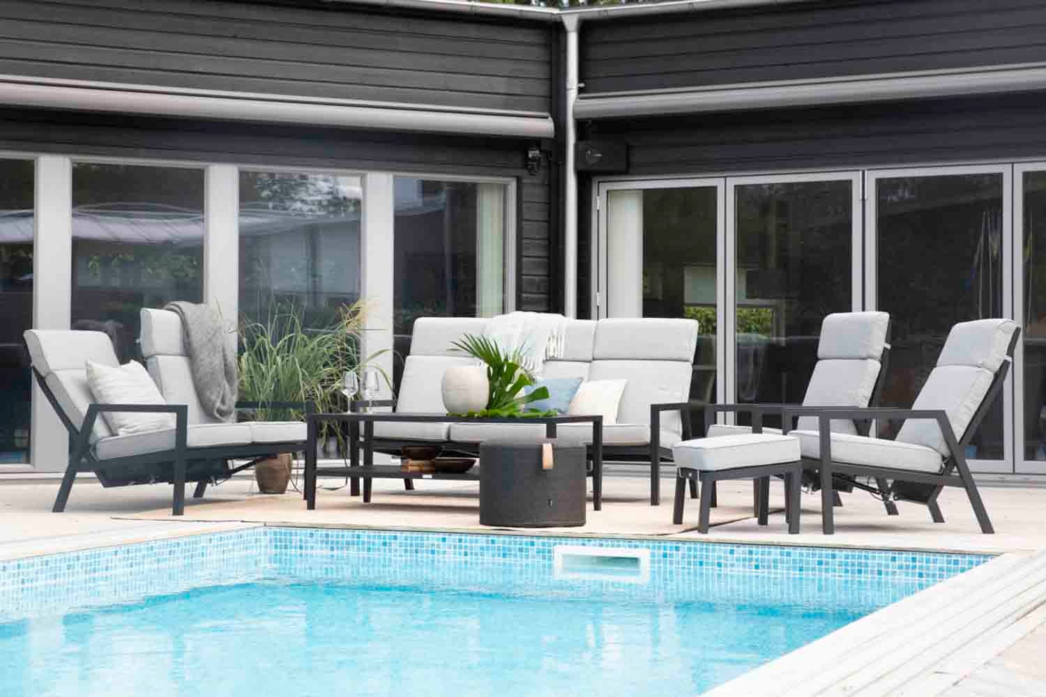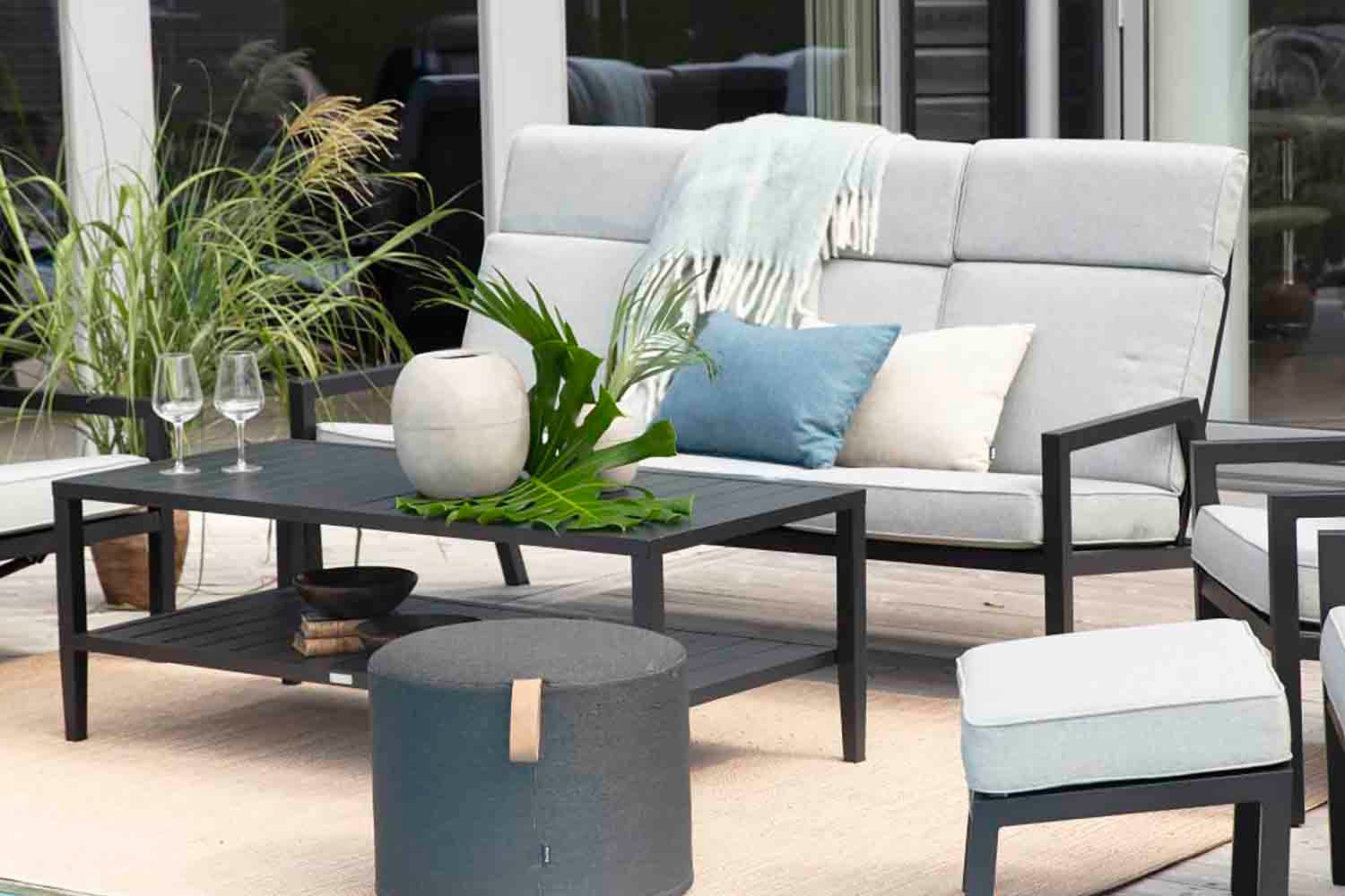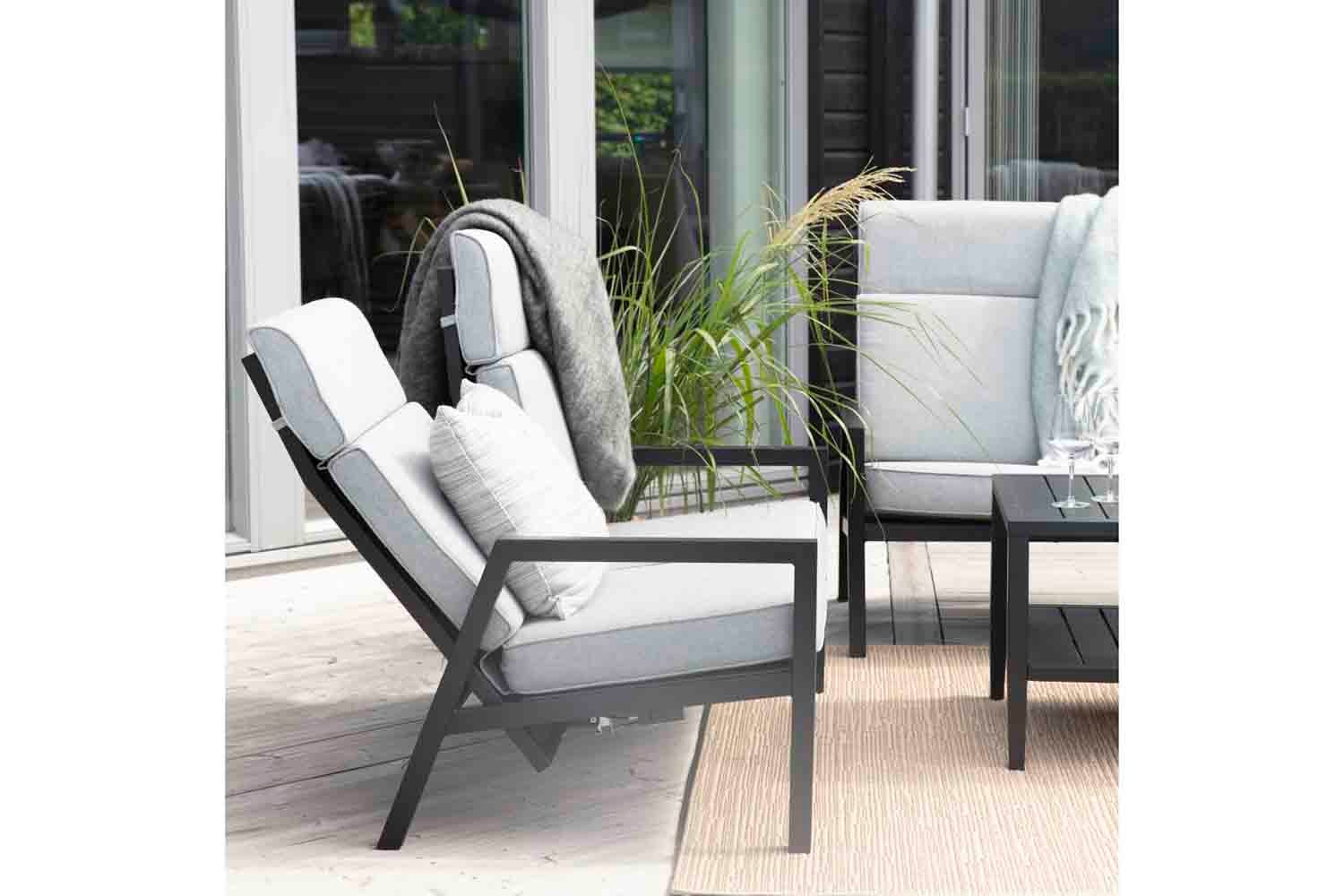 En modern loungeserie med utmärkt sittkomfort. Du kan välja mellan matt vit eller svart aluminium med grå textilene och dynorna som följer med är av hög kvalitet och klädda med olefintyg. Serien består av flera separata delar som ger dig frihet att skapa en trivsam och funktionell uteplats oavsett om den är liten eller stor.