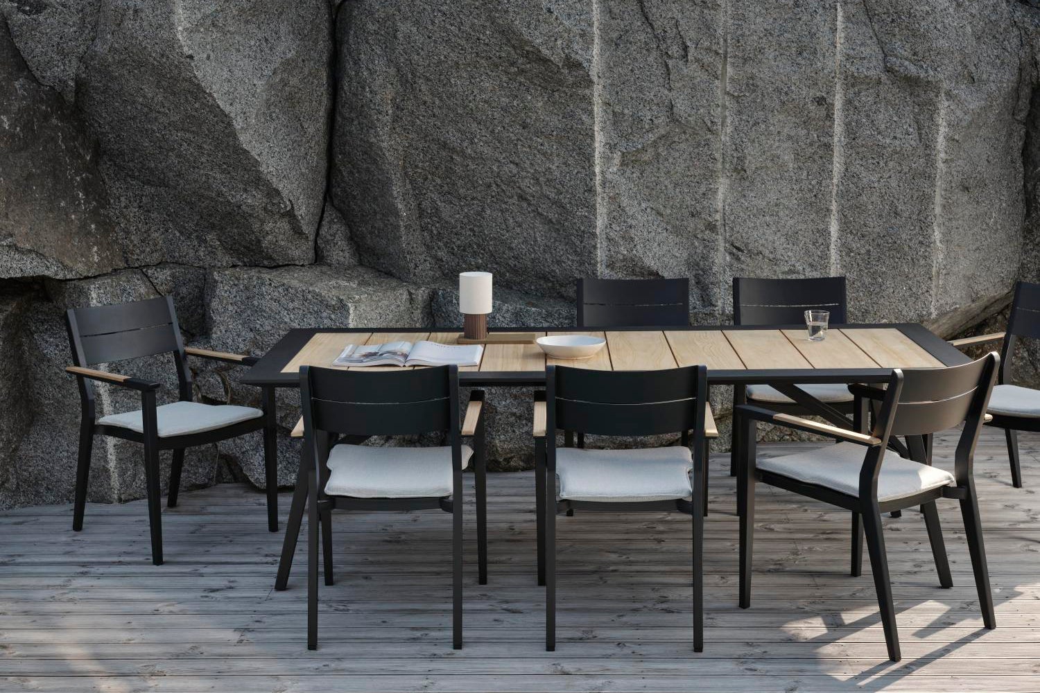 Ett bord med skiva av tvärgående teakribbor och en stapelstol med matchande sits och rygg gör Chios till en vacker, lättplacerad matgrupp. Trots smäckra dimensioner tål den att stå ute år efter år och kräver minimalt underhåll. Till Chiosfamiljen hör också en matchande liten 2-sits soffa, däckstol och soffgrupp i samma eleganta teakutförande. Stolen har beslag i rostfritt stål.