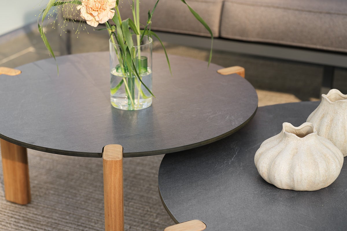 Sofaborde i to forskellige højder. Domino-bordene tilføjer et ekstra strejf af elegance og materialer af højeste kvalitet, med robuste ben i teak og en holdbar laminatplade.