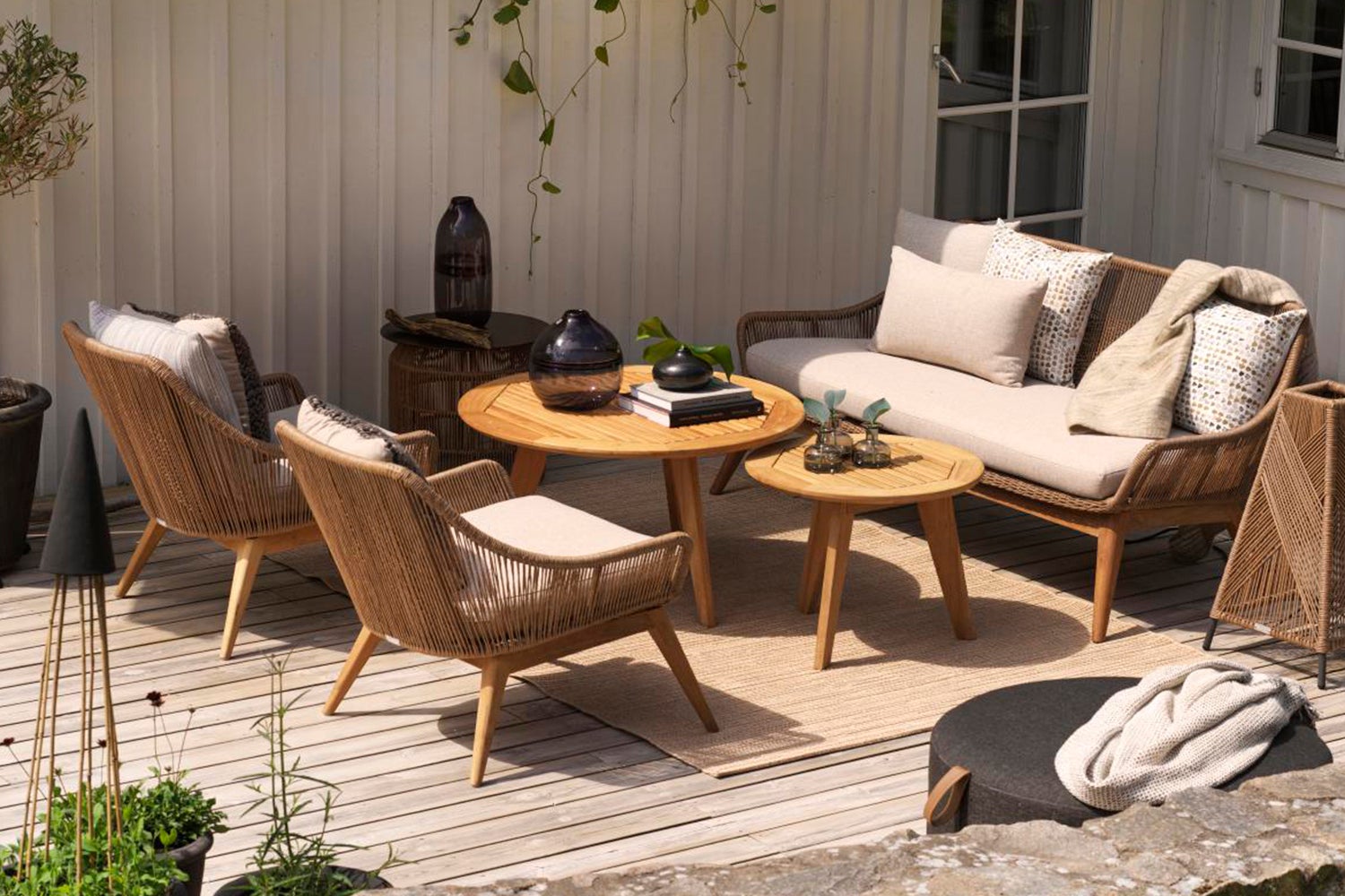 Tidlös design i en varm och inbjudande stil, dekorativt flätad och en klassisk stomme i teak. Sittdynor medföljer. Hög flexibilitet: använd egna dynor till ryggen och förnya stil och design när andan faller på.