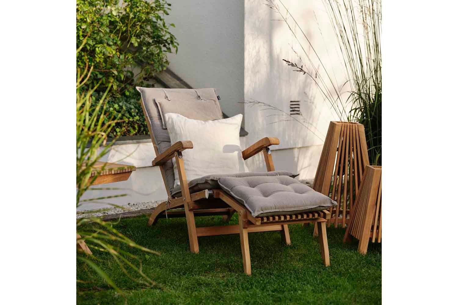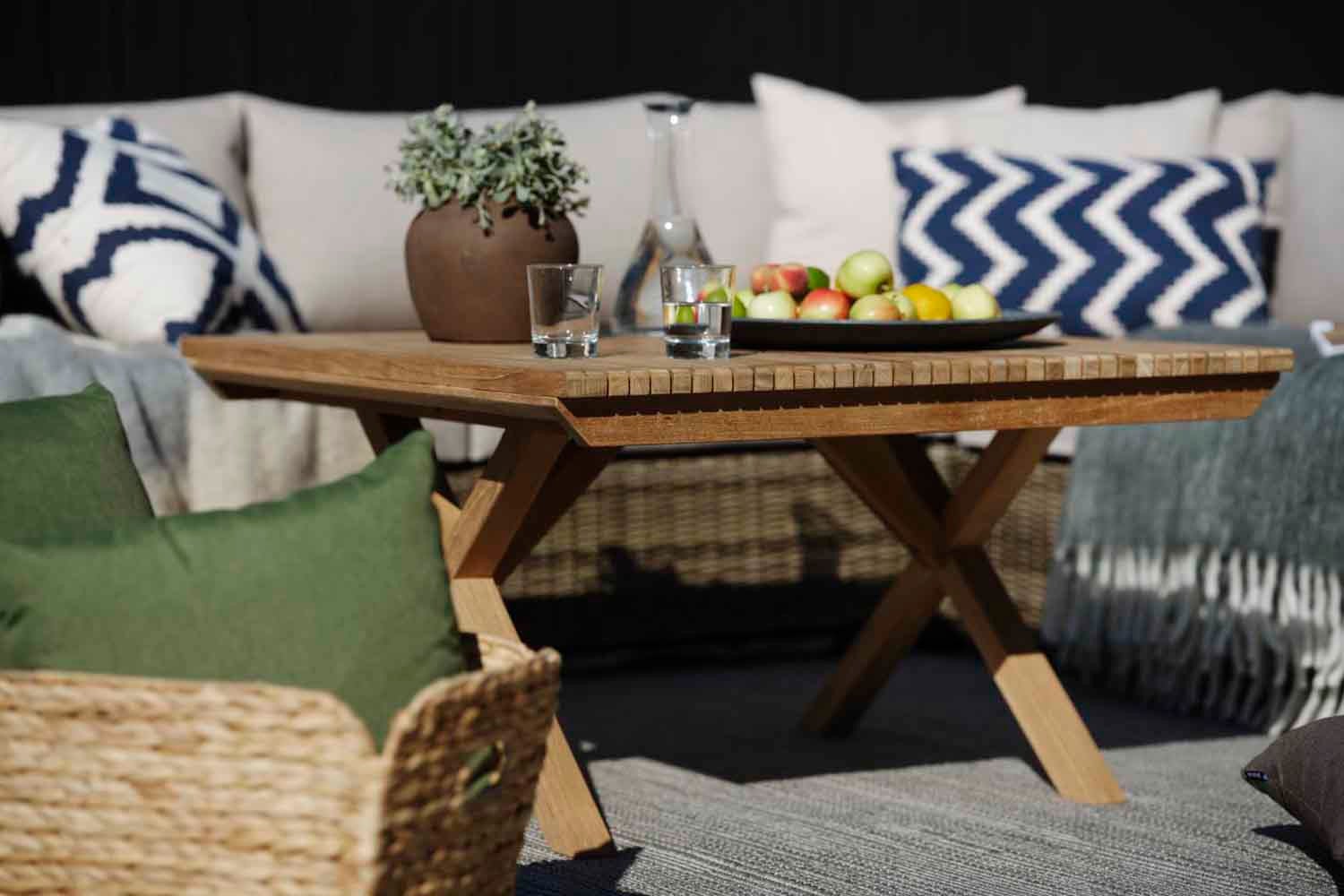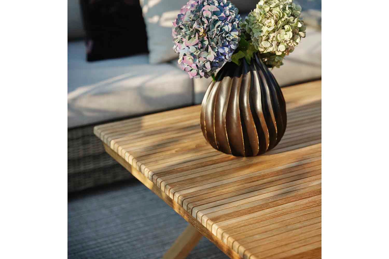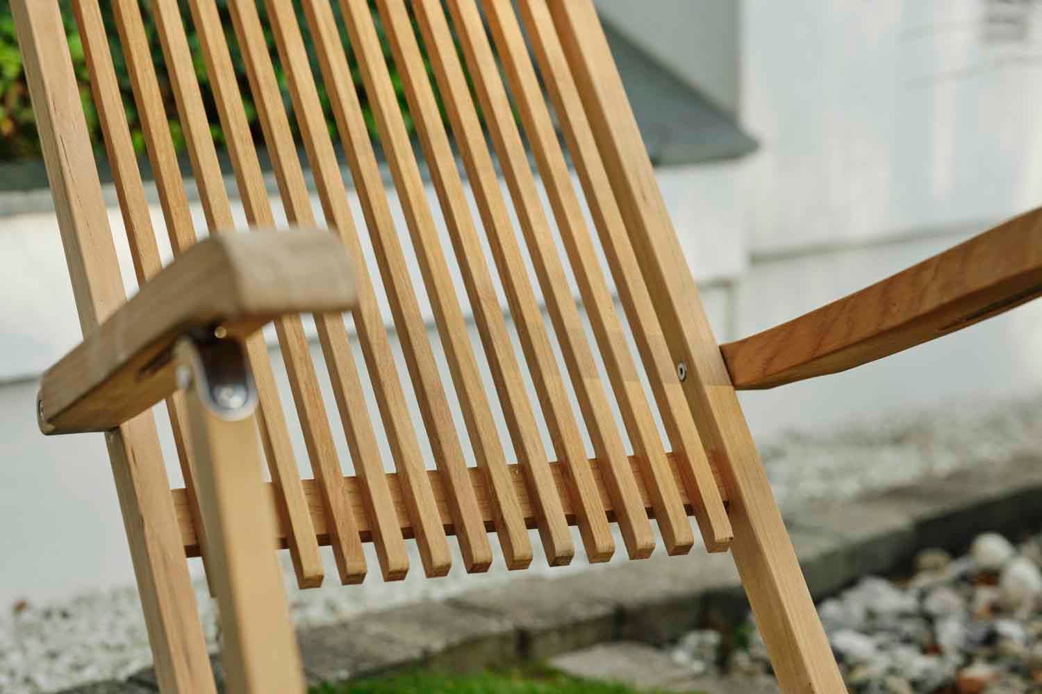 Et smukt premium-sæt med tværgående teak-lameller som gennemgående træk – møblerne har de lige linjer, som er typisk for skandinavisk design og giver en skøn spiseplads, der skiller sig ud samtidig med, at de falder ind i omgivelserne.