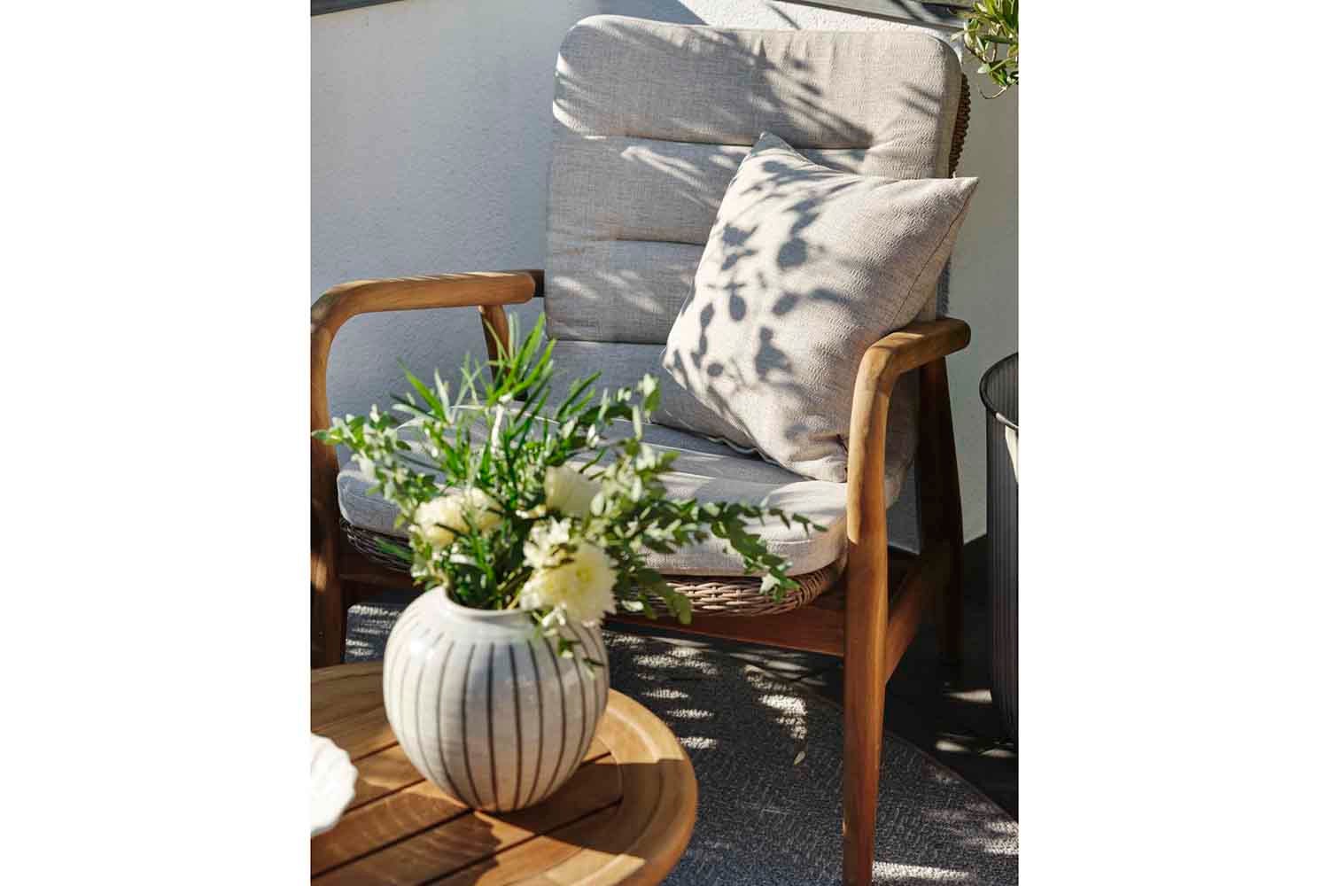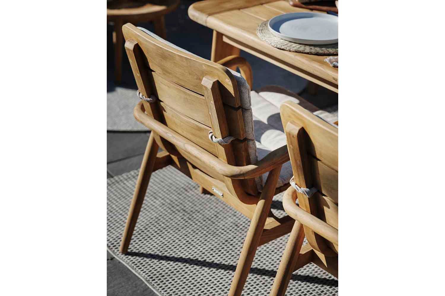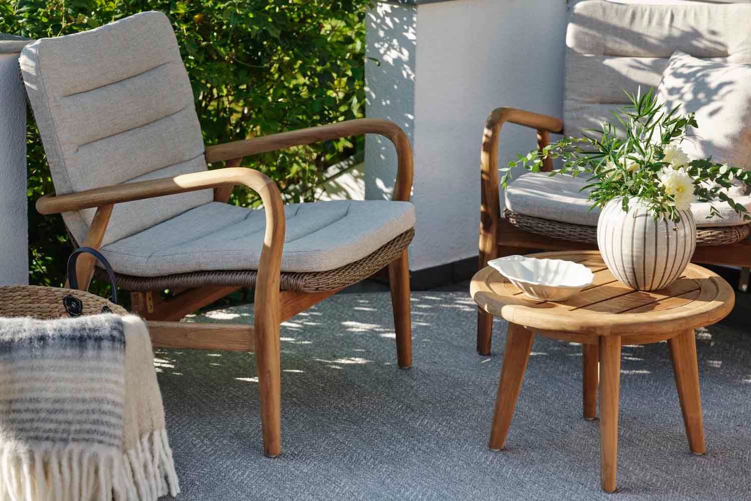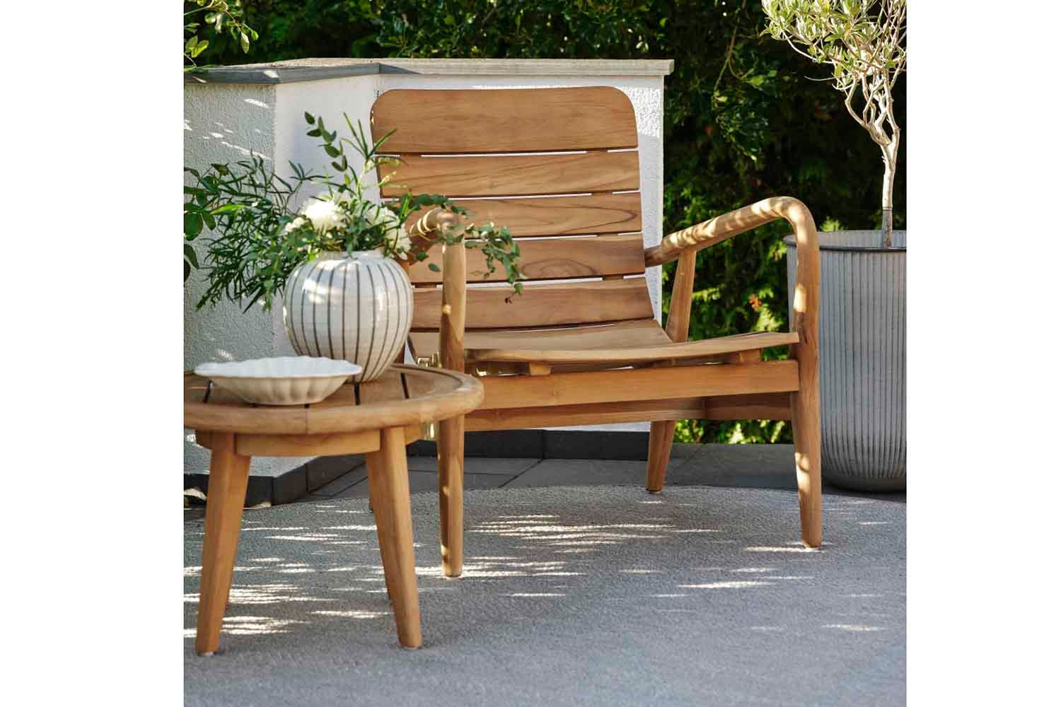 Lilja er et sæt, der passer til både afslapning og måltider. Runde organiske former i teak. Solide møbler, som samtidig er elegante på grund af de afrundede detaljer.