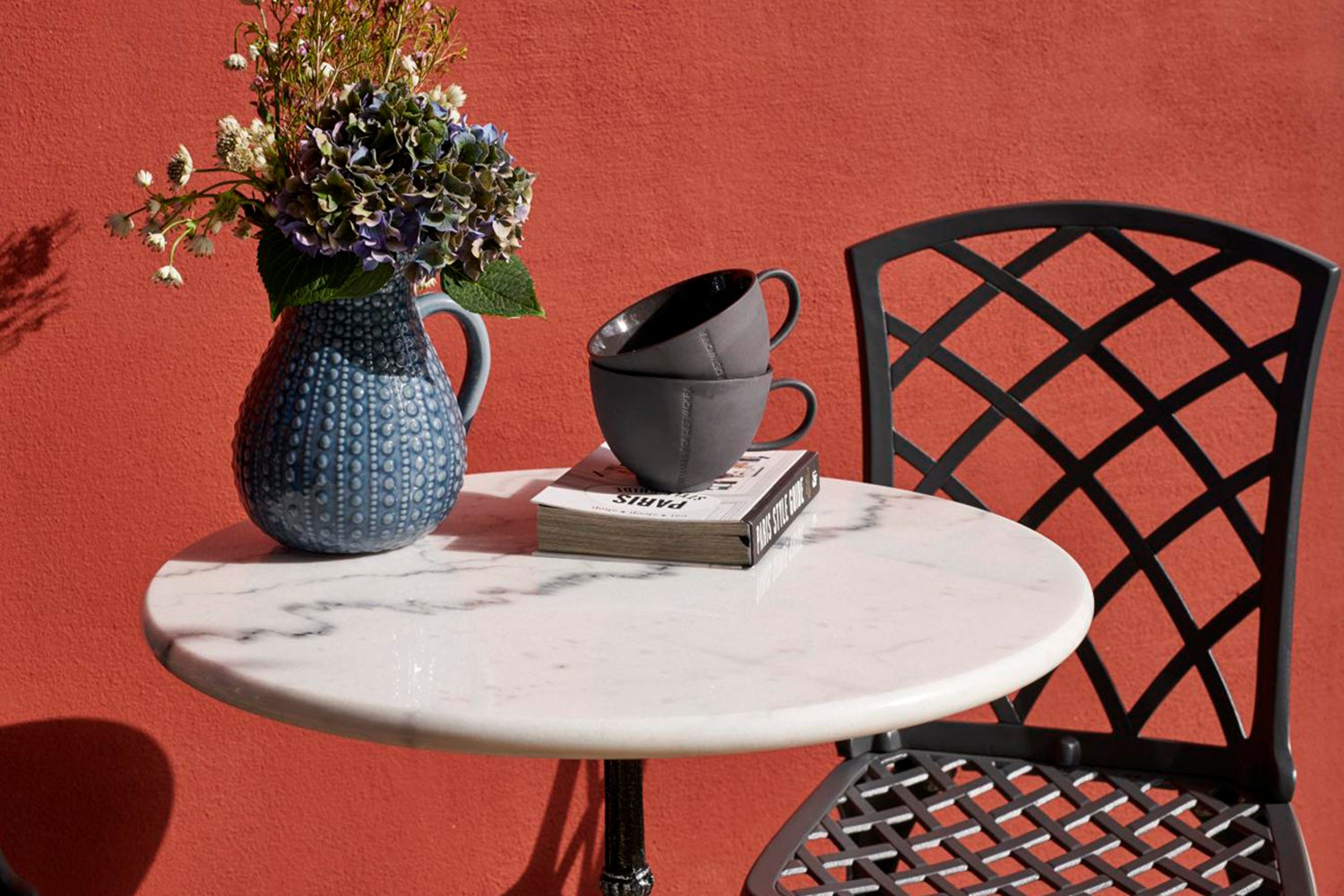 Marmorbord med underrede i gjutjärn och bordsskiva av vit eller svart marmor.