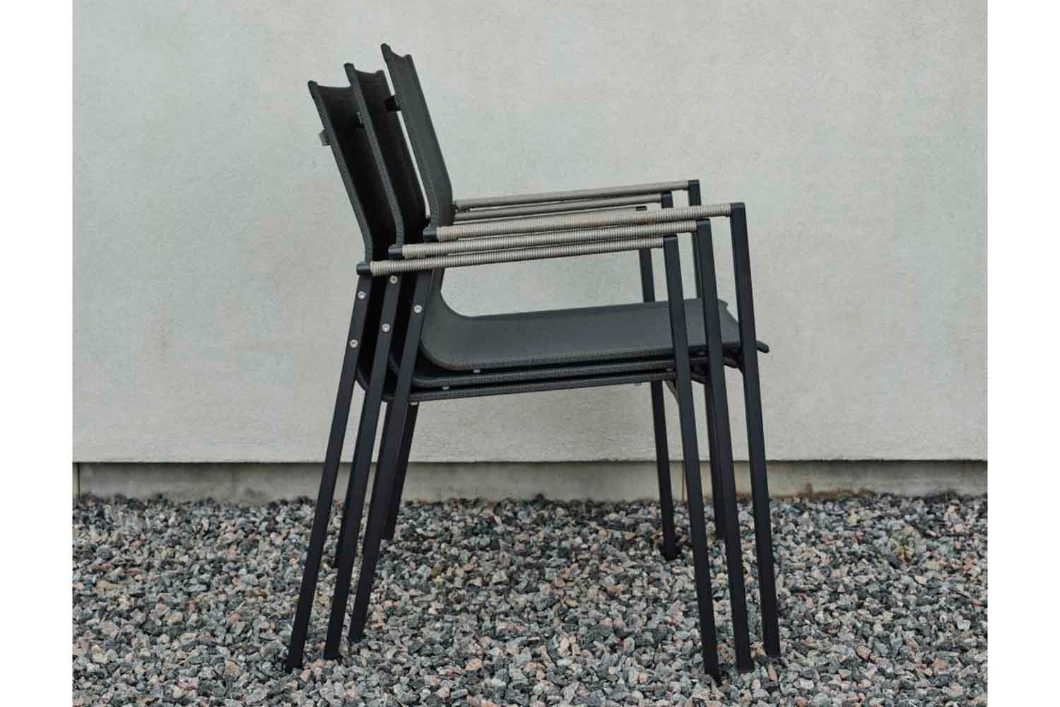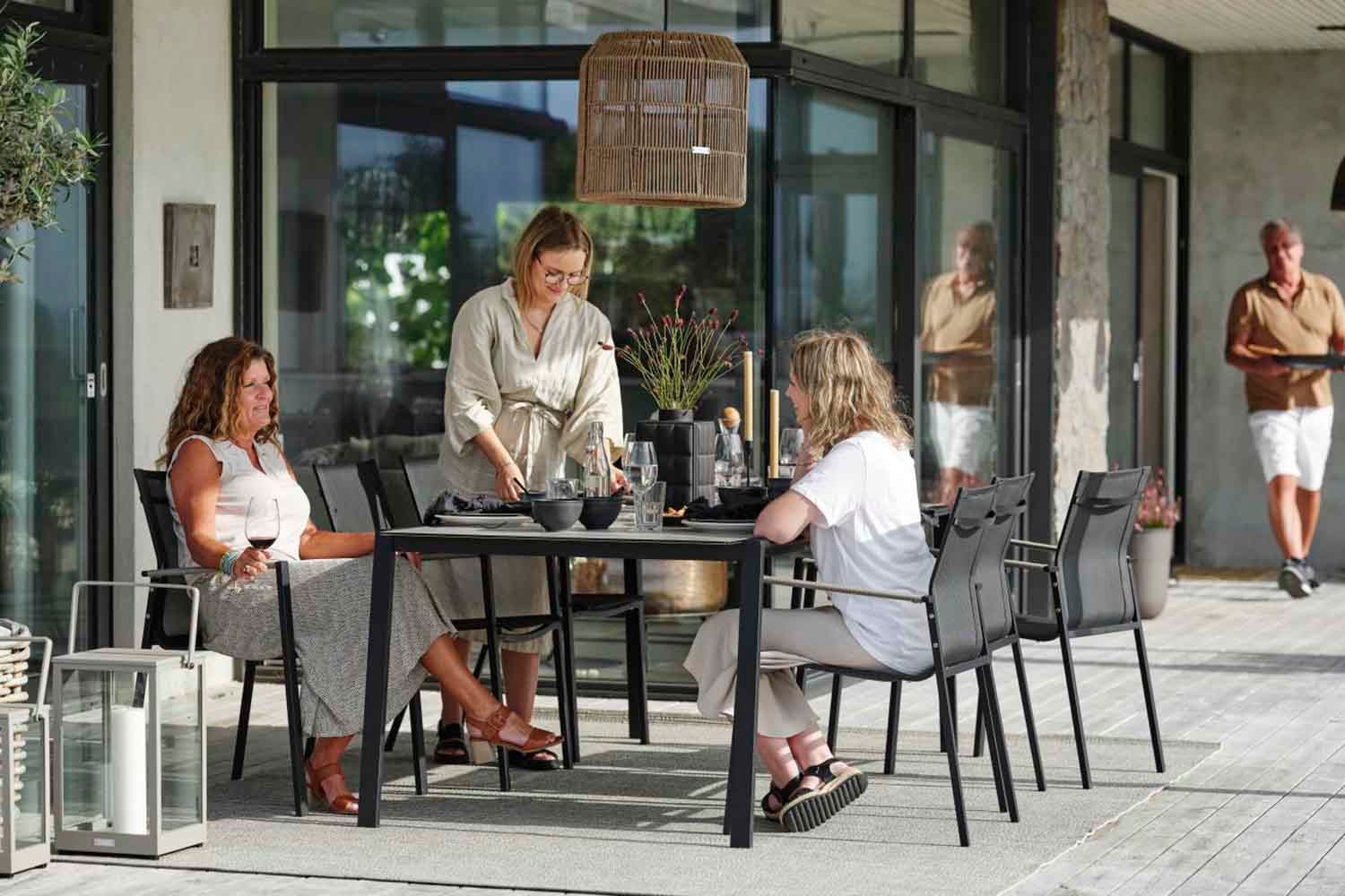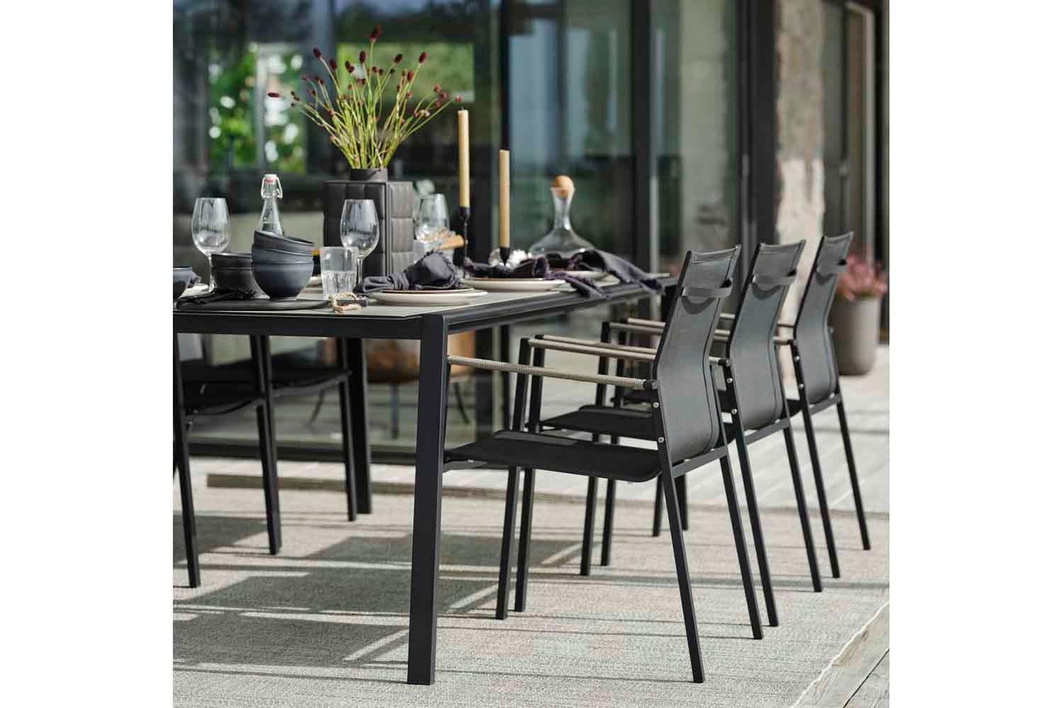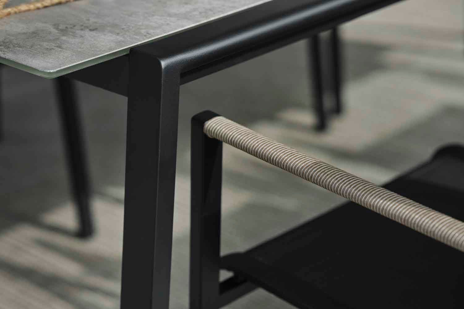 Lyra er en moderne og meget elegant serie i en dejlig blanding af materialer. Rammen er lavet af sort pulverlakeret rustfrit stål (304), perfekt til at modstå forskellige vejrforhold. Smukke detaljer af kunstig rattan på armlænene.