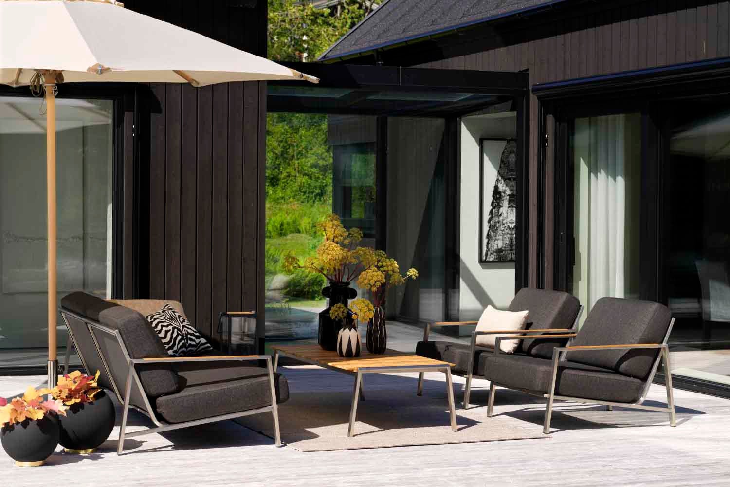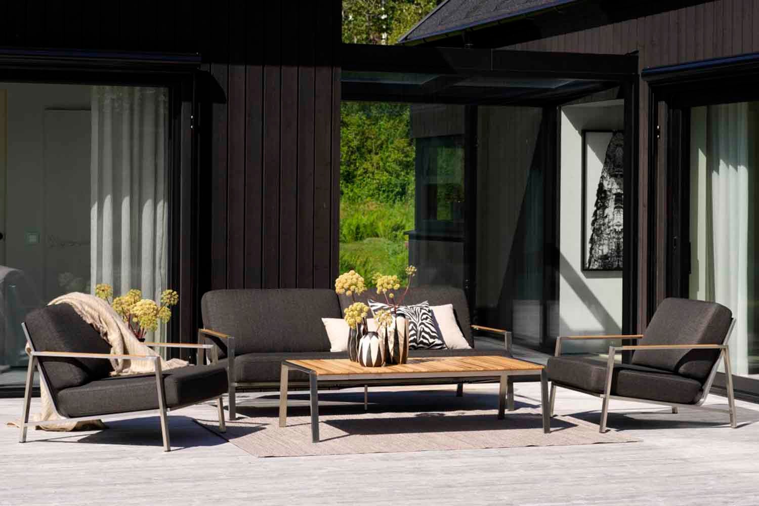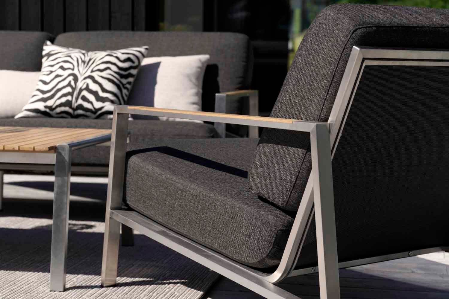 Rena linjer och tidlös design i en modern tappning. Den låga sitthöjden förstärker känslan av modern loungestil. Blandningen av material är spännande: rostfritt stål (316) och teakdetaljer på armstöden och bordsskivan. Riktigt sköna dynor av högdensitetsskum med klädsel av fodrat olefintyg som gör dem vattenavvisande. Det här är en sittgrupp med snygga detaljer och vinklar.
