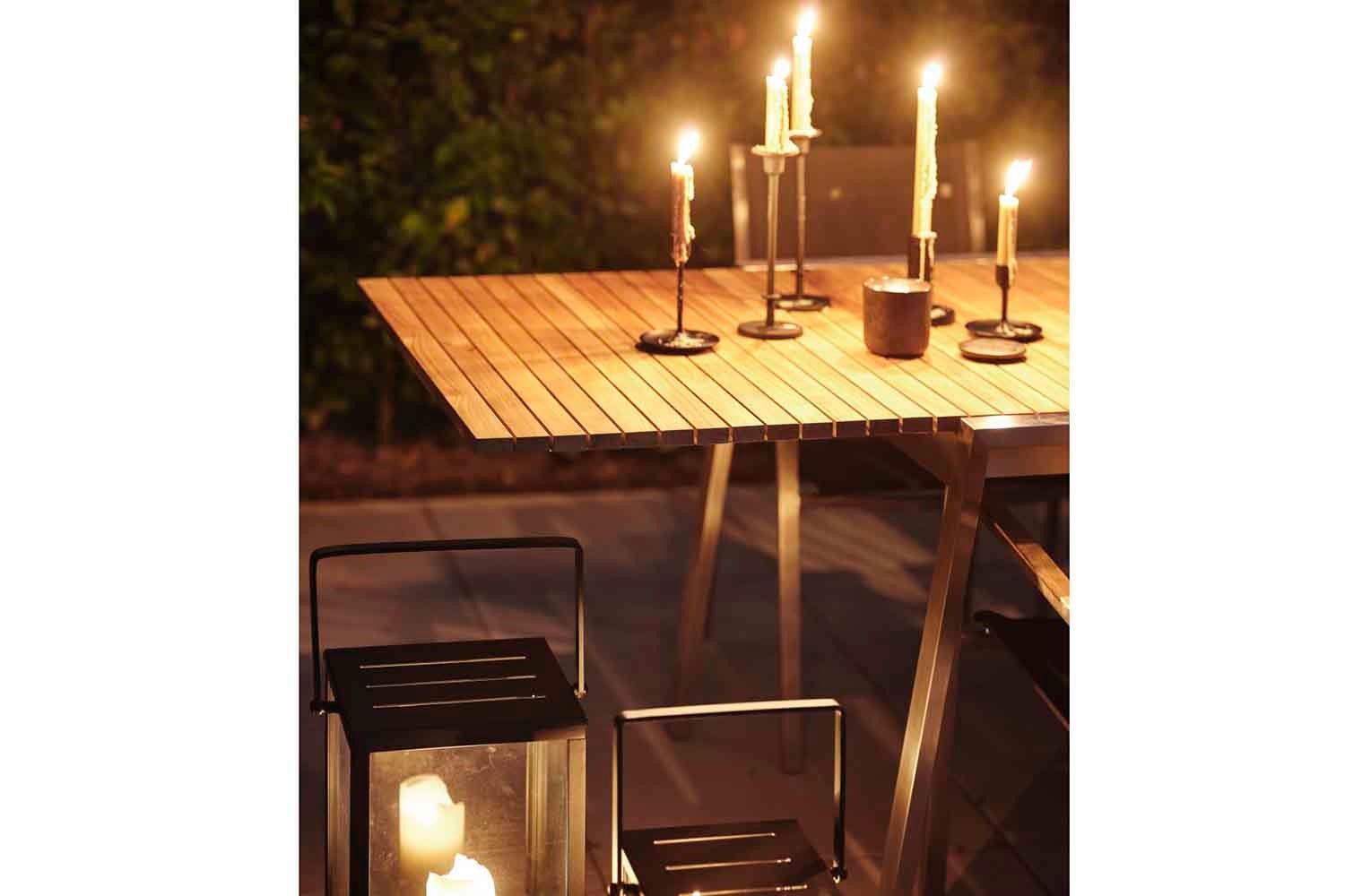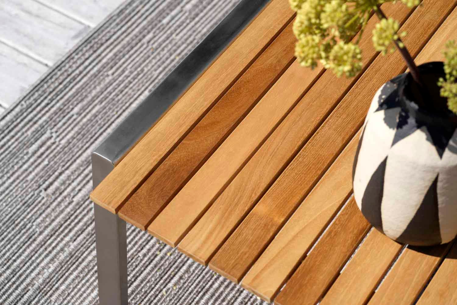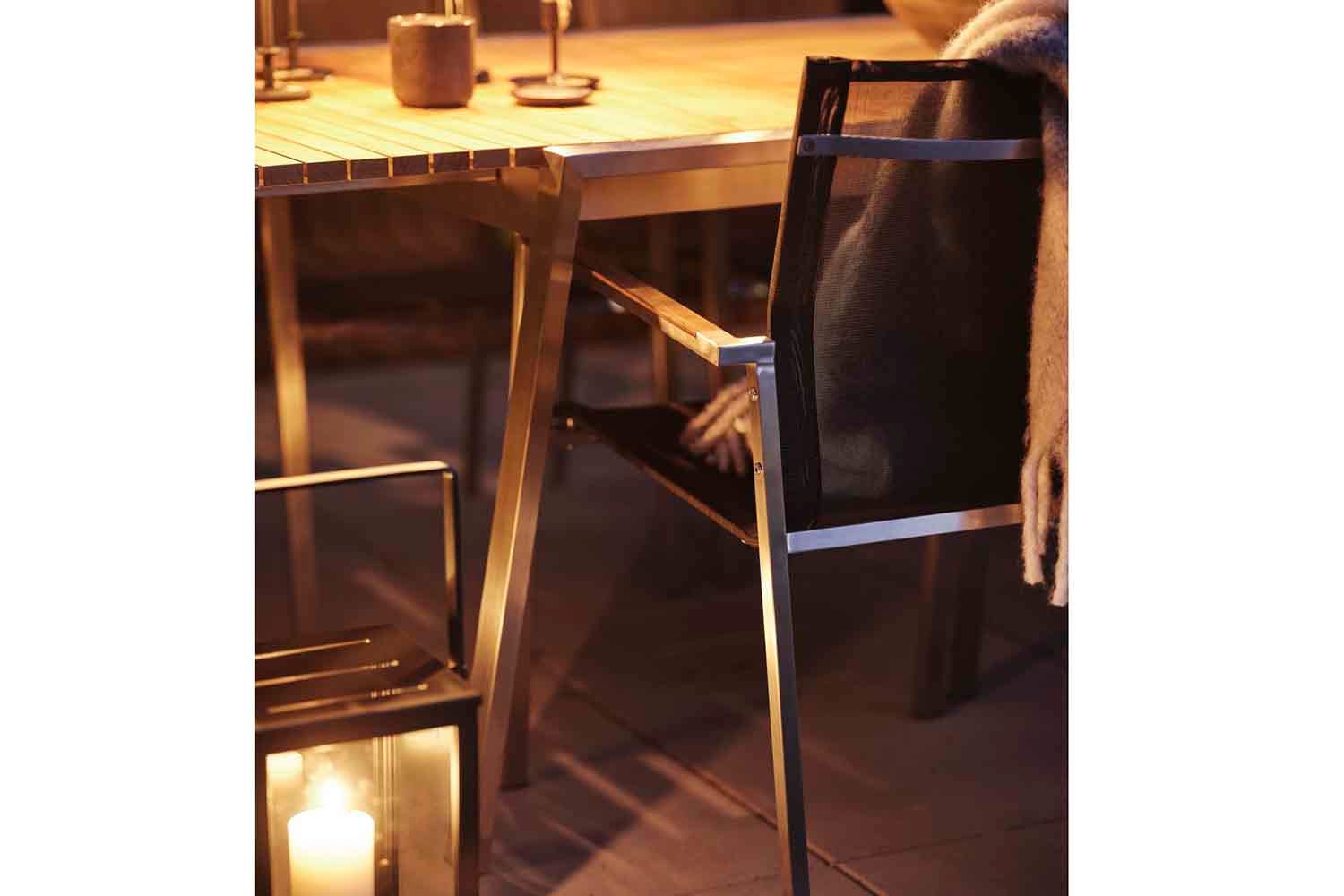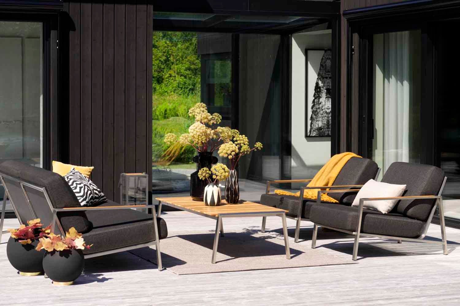 Rena linjer och tidlös design i en modern tappning. Den låga sitthöjden förstärker känslan av modern loungestil. Blandningen av material är spännande: rostfritt stål (316) och teakdetaljer på armstöden och bordsskivan. Riktigt sköna dynor av högdensitetsskum med klädsel av fodrat olefintyg som gör dem vattenavvisande. Det här är en sittgrupp med snygga detaljer och vinklar.