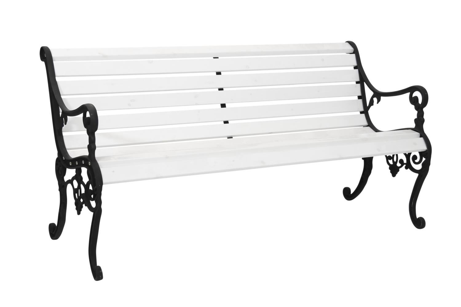 En klassisk parksoffa med anor från förr. De svarta, dekorativa gavlarna är av gjuten aluminium och du sitter skönt på ribbor av vacker furu som är antingen vit- eller brunlaserade.