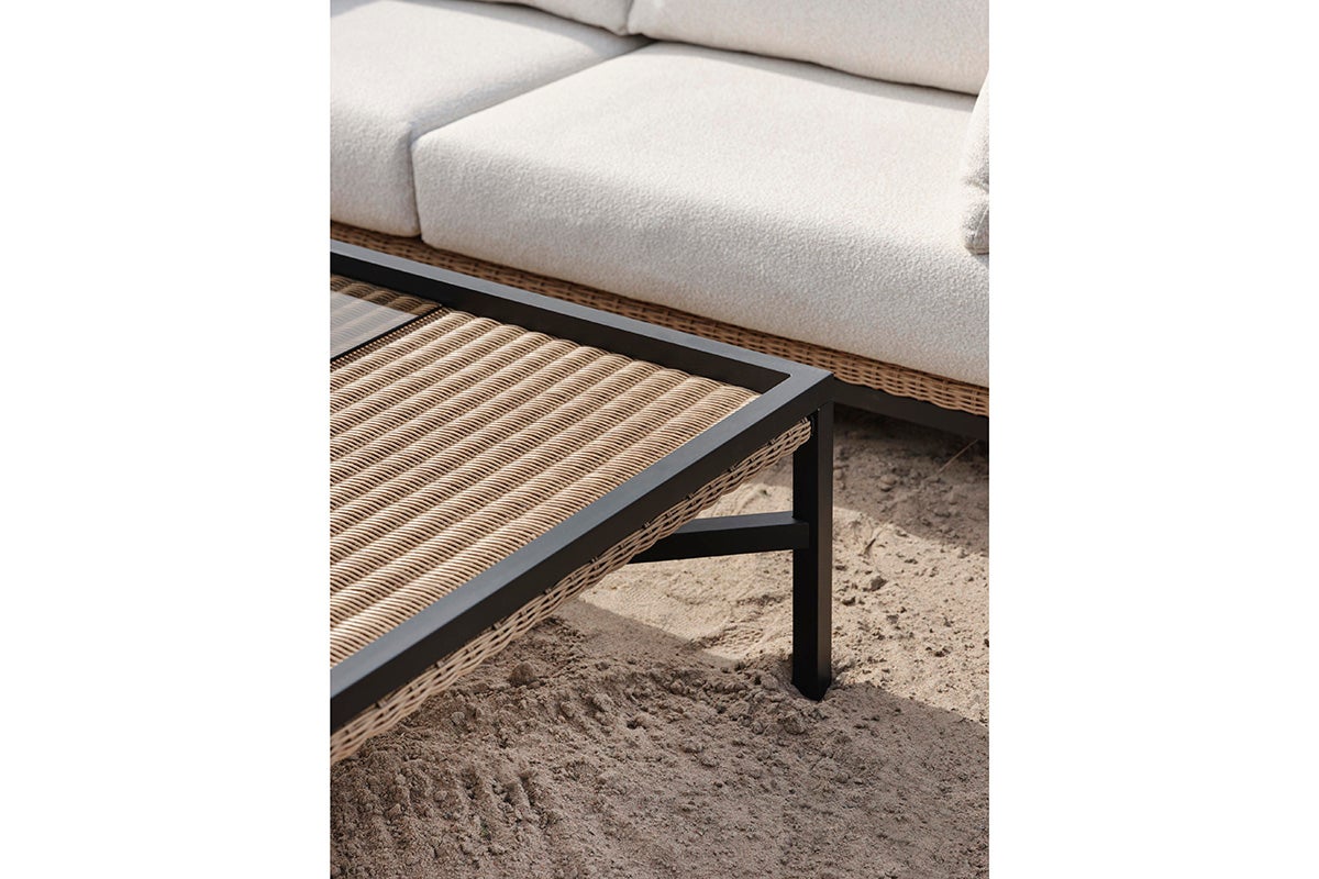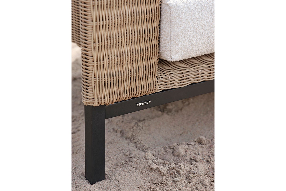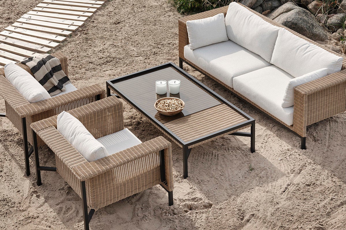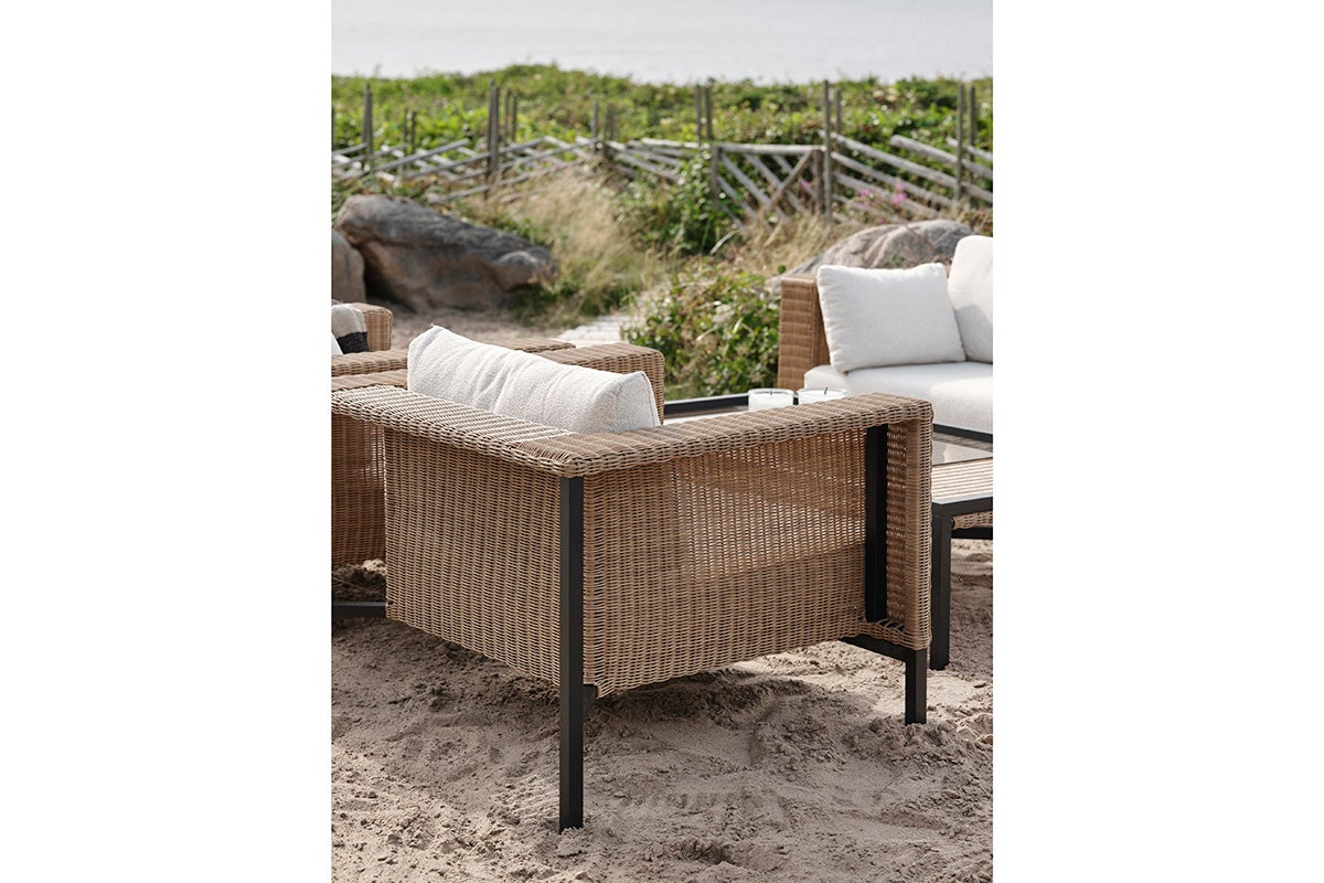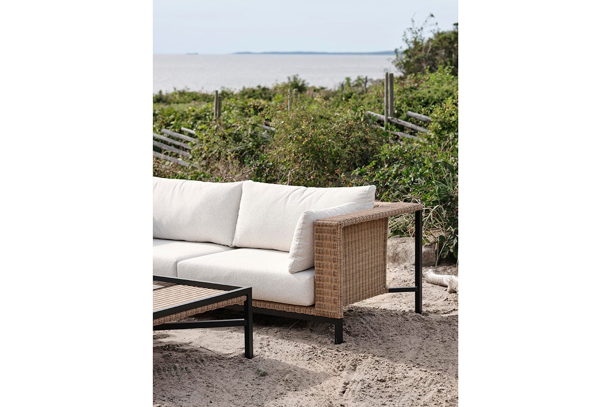 Det, der adskiller Shell, er dets unikke fusion af designpåvirkninger. De rene linjer og neutrale farvepalet udtrykker den rolige enkelhed i skandinavisk design, mens varmen og teksturen fra rattan indfanger den afslappede, solfyldte stemning fra Middelhavet. Denne blanding gør Shell til det perfekte valg for dem, der ønsker at skabe en udendørs oase, der både er trendy og tidløs. Den åbne ryg afslører rammen, hvilket gør den til et iøjnefaldende designelement. Bløde, dybe hynder i et blidt og sofistikeret hvidt stof fuldender looket.