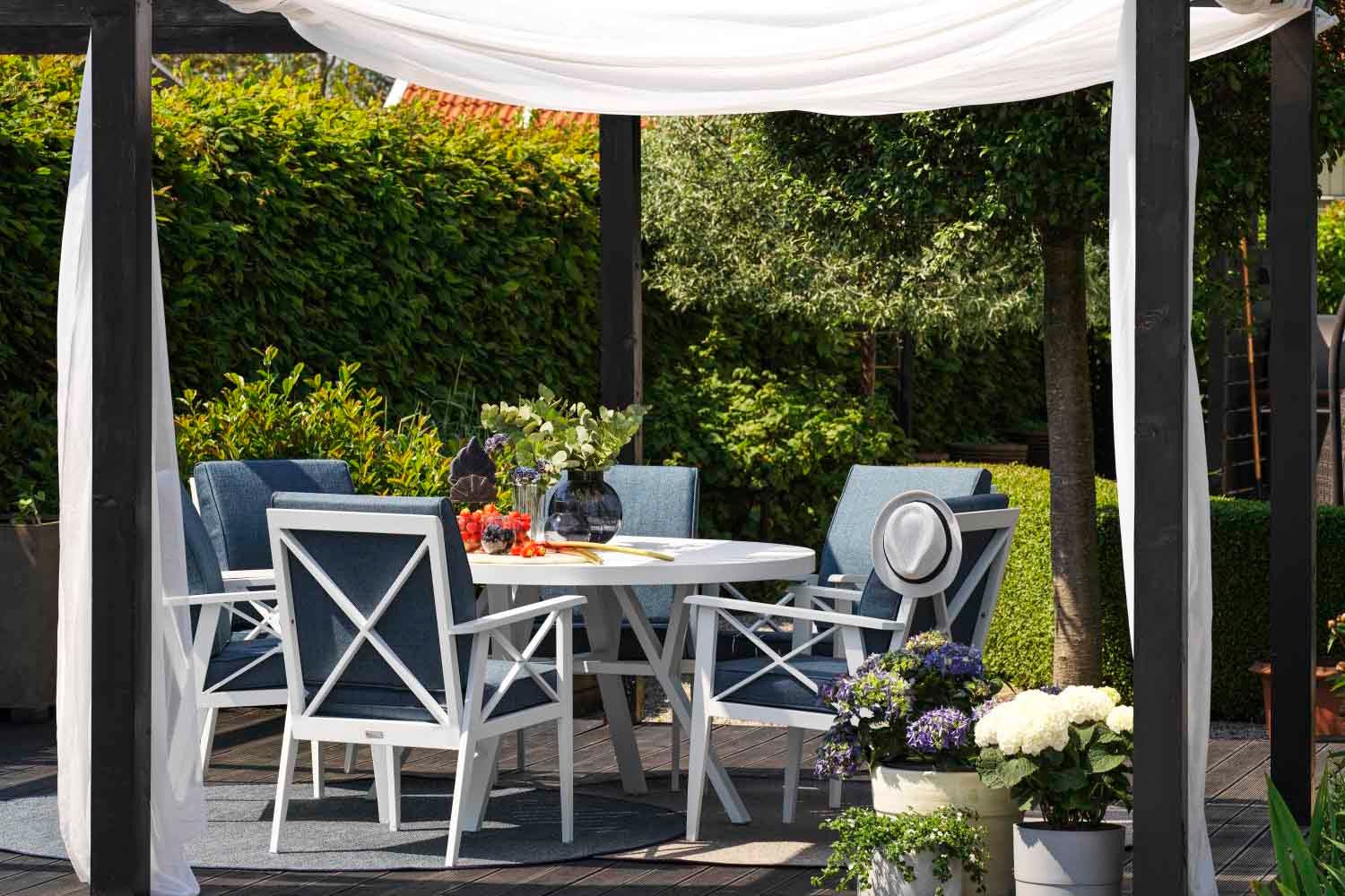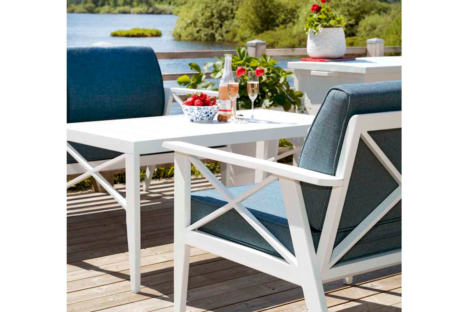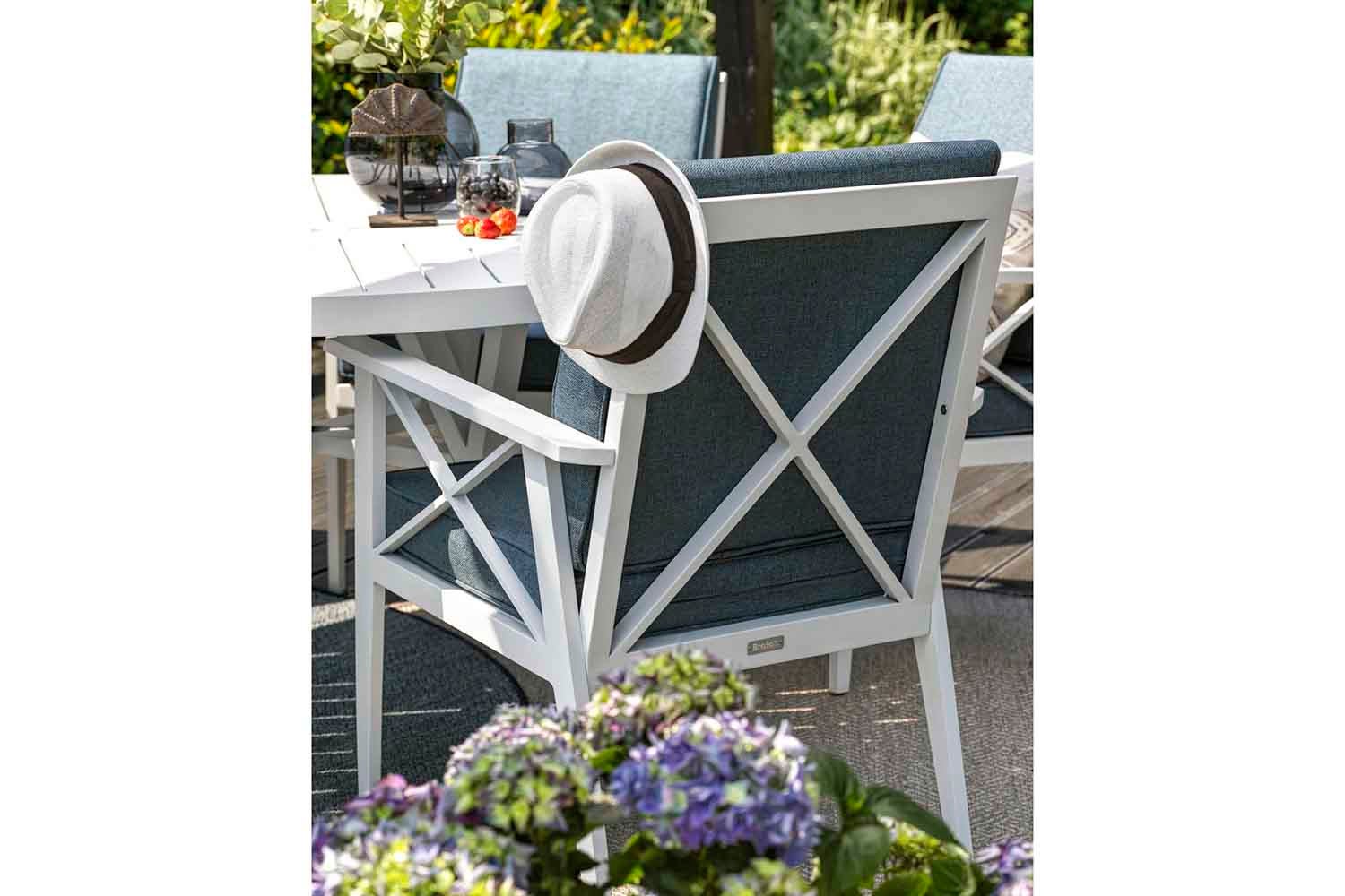 Klassisk design inspirerad av ett tidlöst formspråk och en tydlig skärgårdskänsla. En vit aluminiumgrupp med vackert formade detaljer som kryss i ryggen, avsmalnande ben och dynor i olefintyg. Dynorna är formade med extra stöd i ryggen. Borden har präglade aluminiumlameller på toppen.