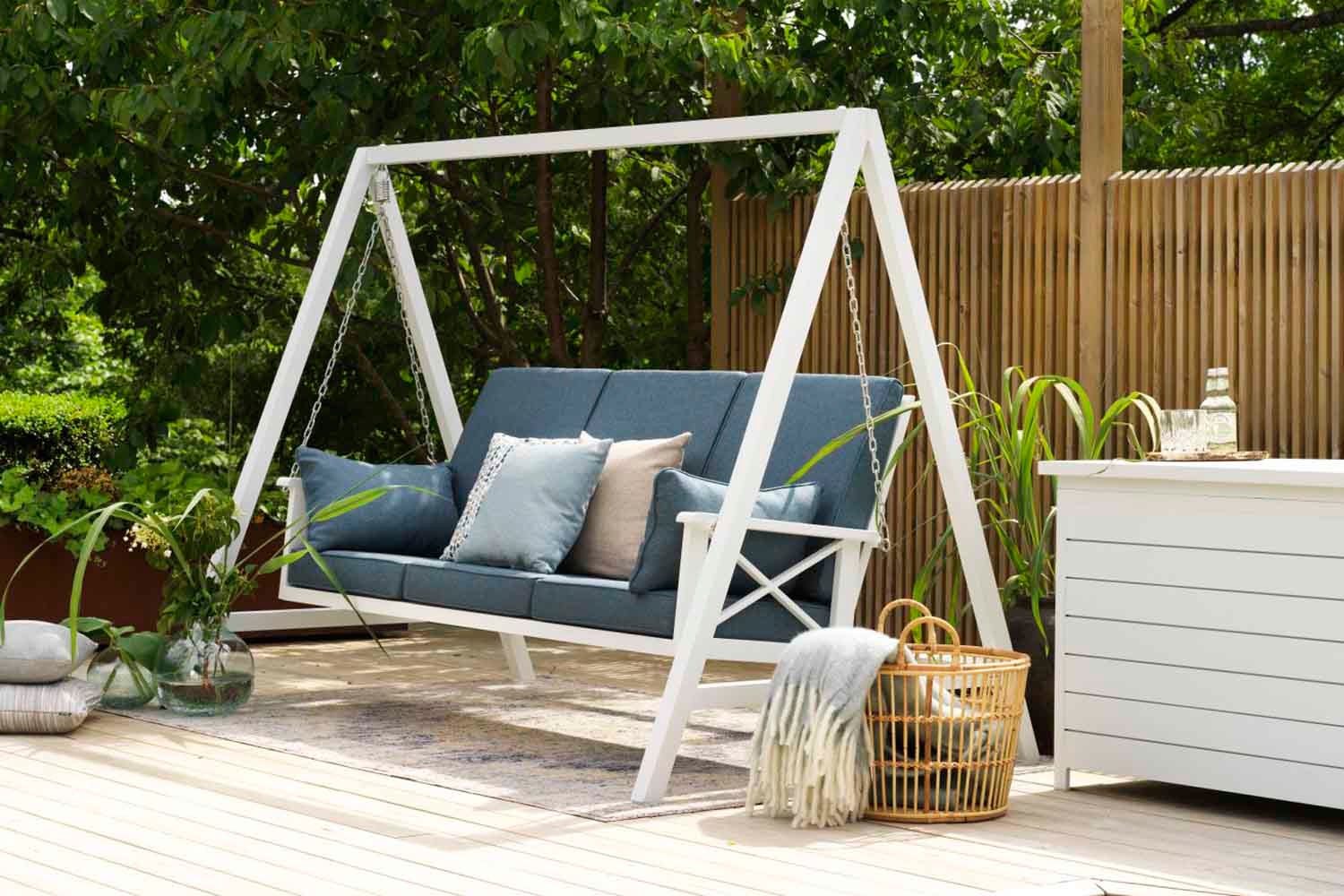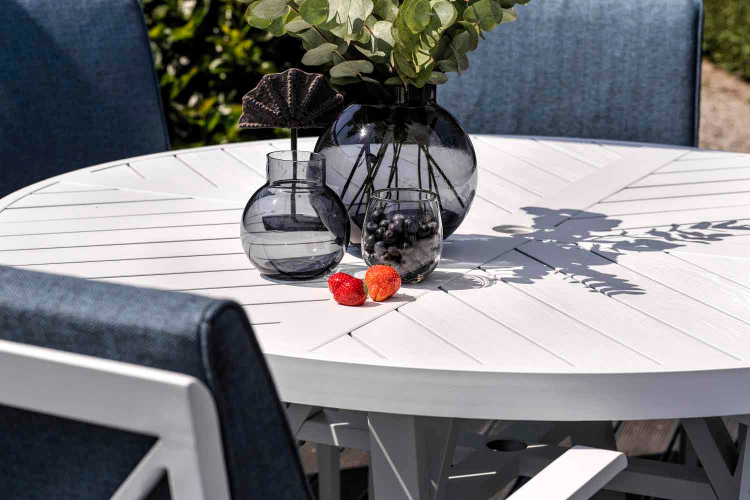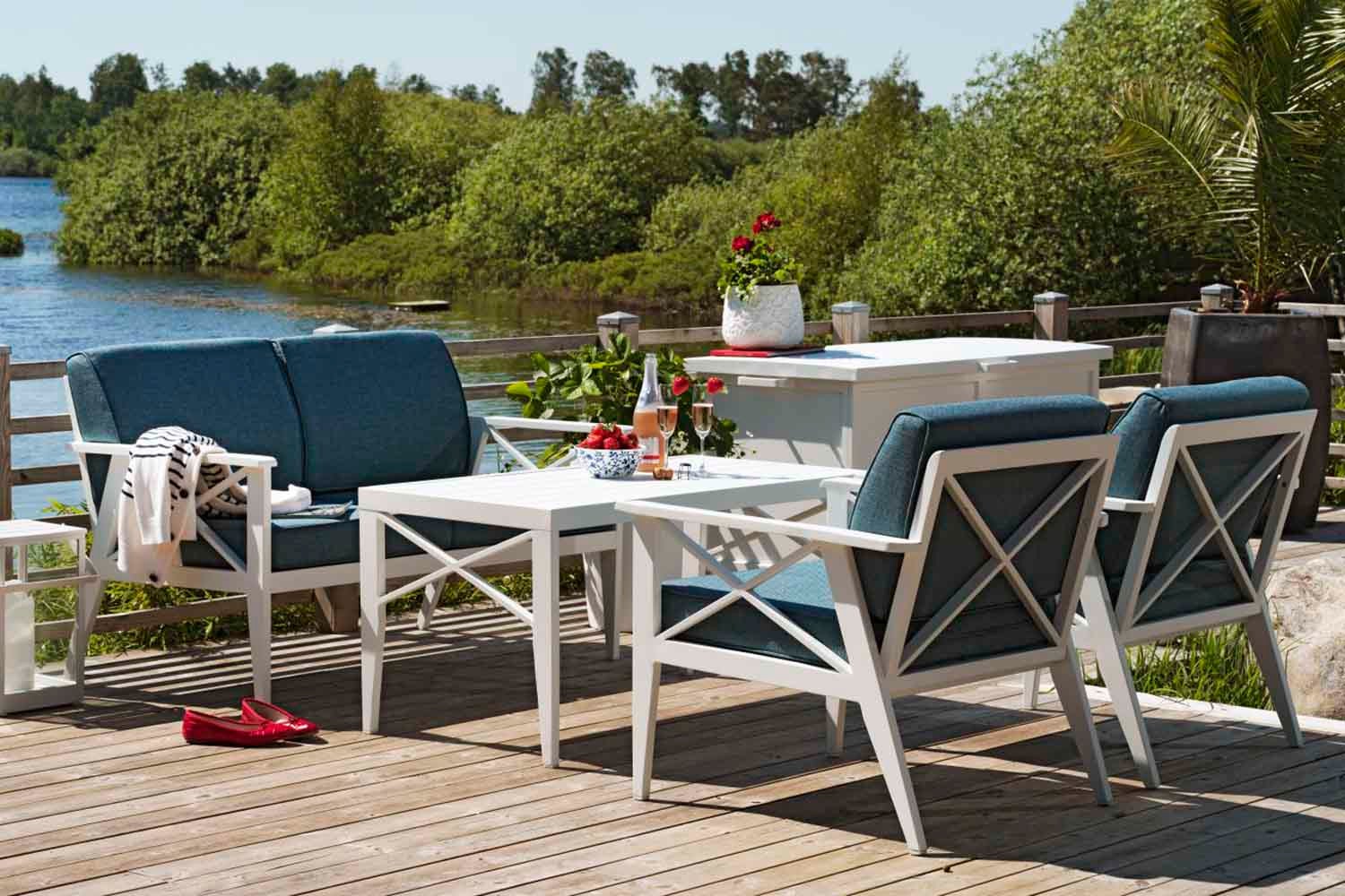 Klassisk design inspirerad av ett tidlöst formspråk och en tydlig skärgårdskänsla. En vit aluminiumgrupp med vackert formade detaljer som kryss i ryggen, avsmalnande ben och dynor i olefintyg. Dynorna är formade med extra stöd i ryggen. Borden har präglade aluminiumlameller på toppen.