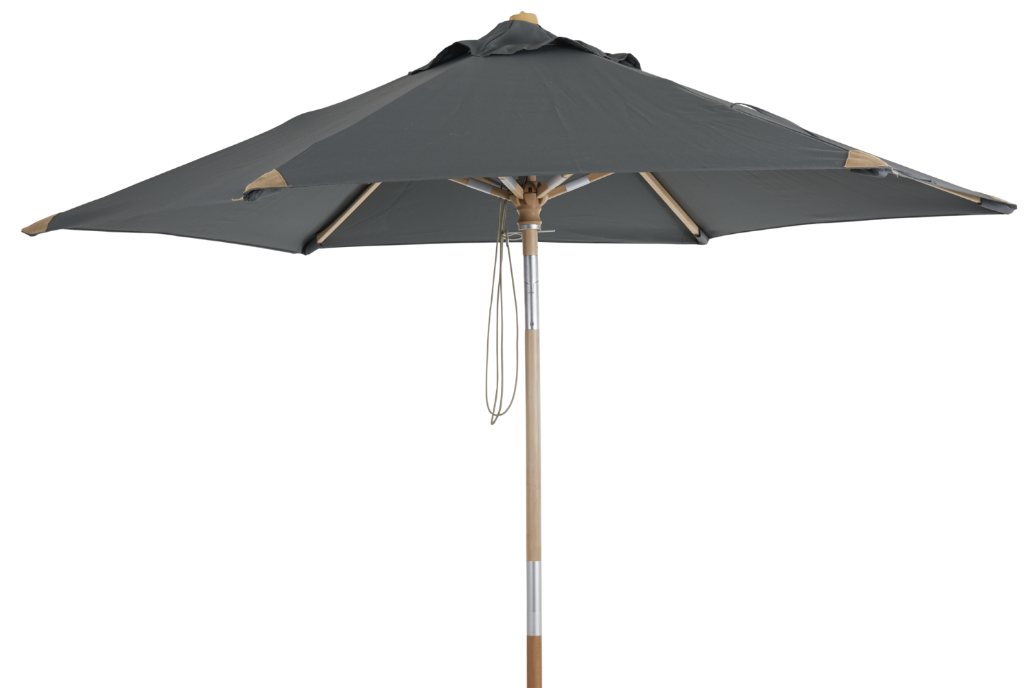 2,5 m parasoll av trä (bok) med mattlackerad yta. 2-delad stång med push-tilt. Vackra läderskoningar och väv av 250 g polyester.